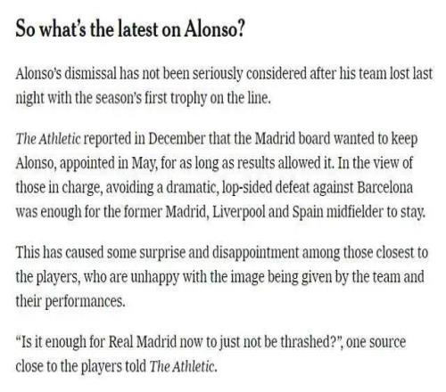 第二是欧冠连遭重创。在欧冠赛场,皇马先后以0-1负于当时在英超挣扎的利物浦,又在主场领先的情况下被曼城2-1逆转。对阵曼城赛后,媒体普遍认为阿隆索的 “未来似乎已经看到了尽头的”。