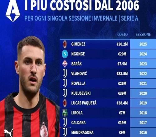 德转列06年至25年意甲冬窗标王:弗拉霍维奇8350万欧第1